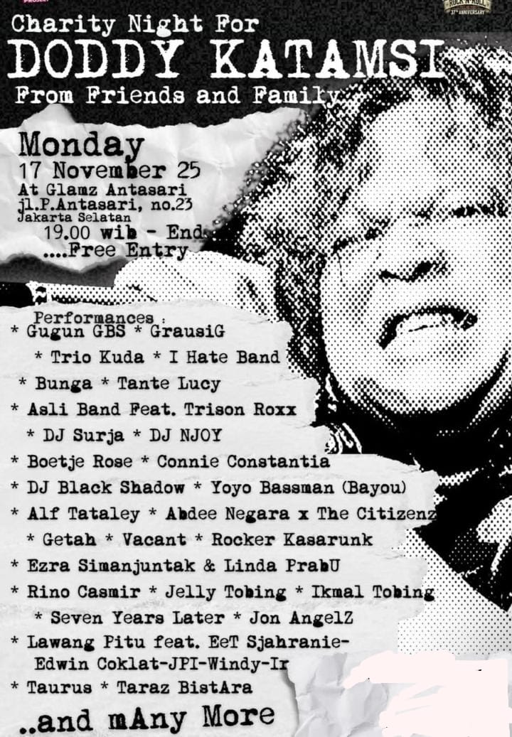 BeritaHarianNusantara, Jakarta, 17 November 2025 – Grup musik rock Lawang Pitu menjadi salah satu bintang tamu dalam acara amal bertajuk “Charity Night For Doddy KatamSY From Friends and Family” di Glamz Antasari, Jl. P. Antasari No. 23, Jakarta Selatan, pada 17 November 2025. Acara ini dimulai pukul 19.00 WIB dan terbuka untuk umum secara gratis.